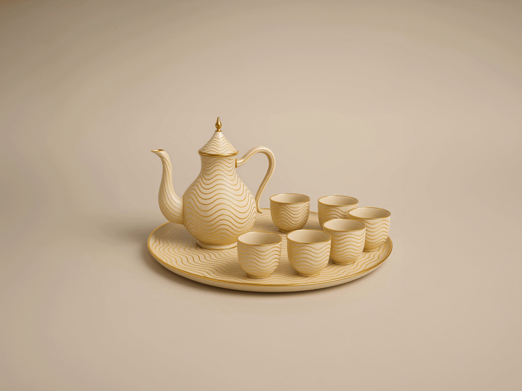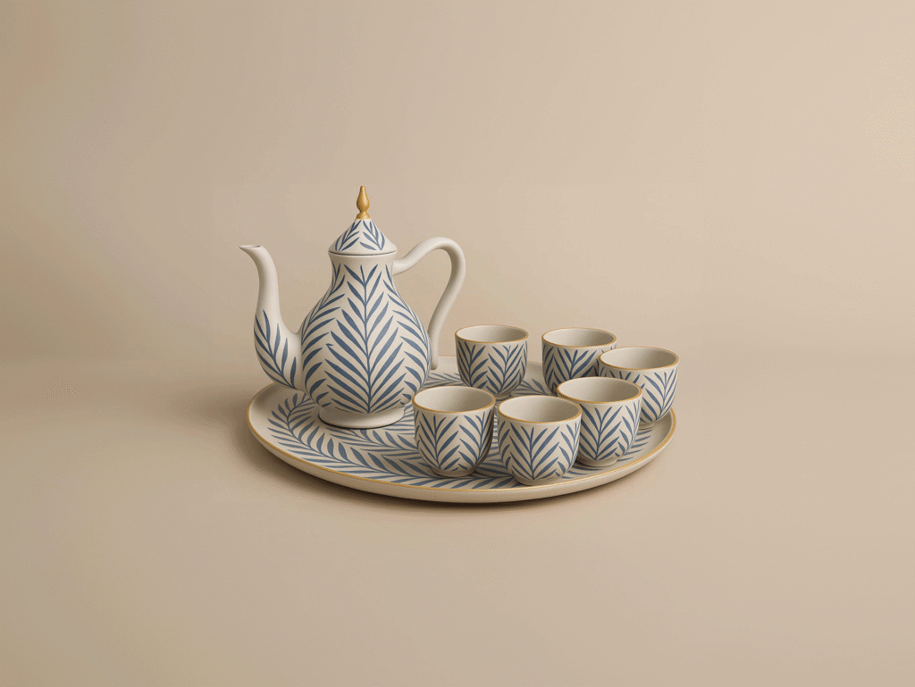 Inspired by the date palm tree, this tea set features vein-like glaze textures symbolizing vitality and natural beauty. A refined design that reflects Middle Eastern cultural heritage.