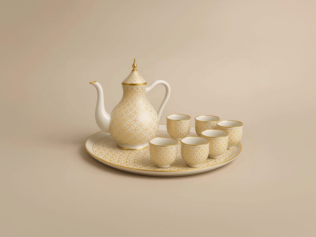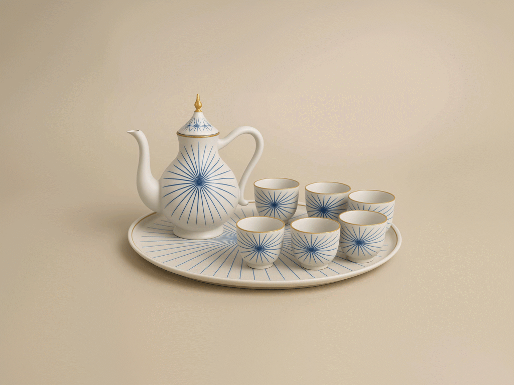 Featuring Middle Eastern geometric art, this tea set is decorated with fractal grid patterns, blending symmetry, order, and elegance. A fusion of modern style and traditional charm.