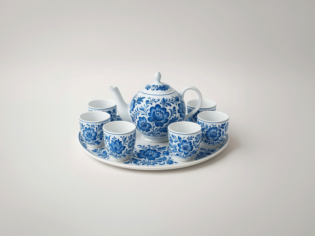 Inspired by the classic Russian Gzhel porcelain, this tea set features elegant blue-and-white floral patterns. Hand-painted, combining functionality with artistic value.