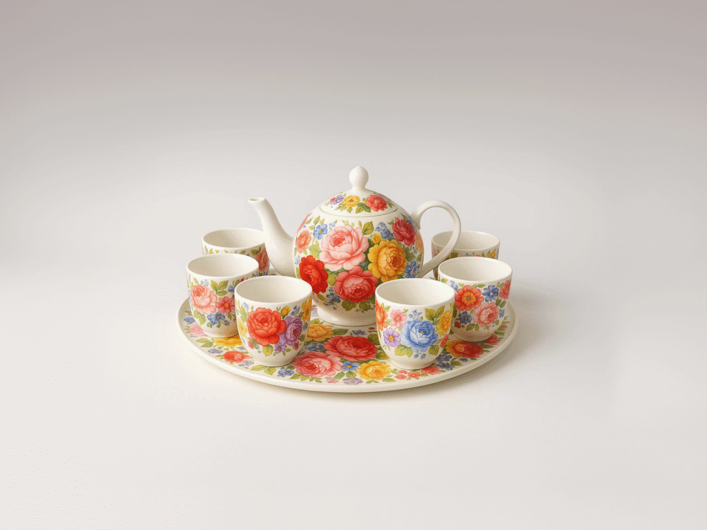 Inspired by Pavlovo-Posad embroidery and scarf motifs, this tea set showcases intricate floral designs, rich in Russian folk artistry and elegance.