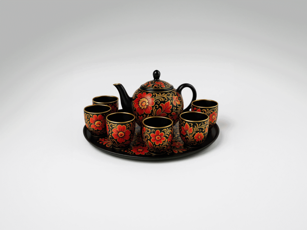 Inspired by the traditional Khokhloma lacquer art, this tea set features bold red and gold floral and vine motifs, radiating festive grandeur and folk charm.